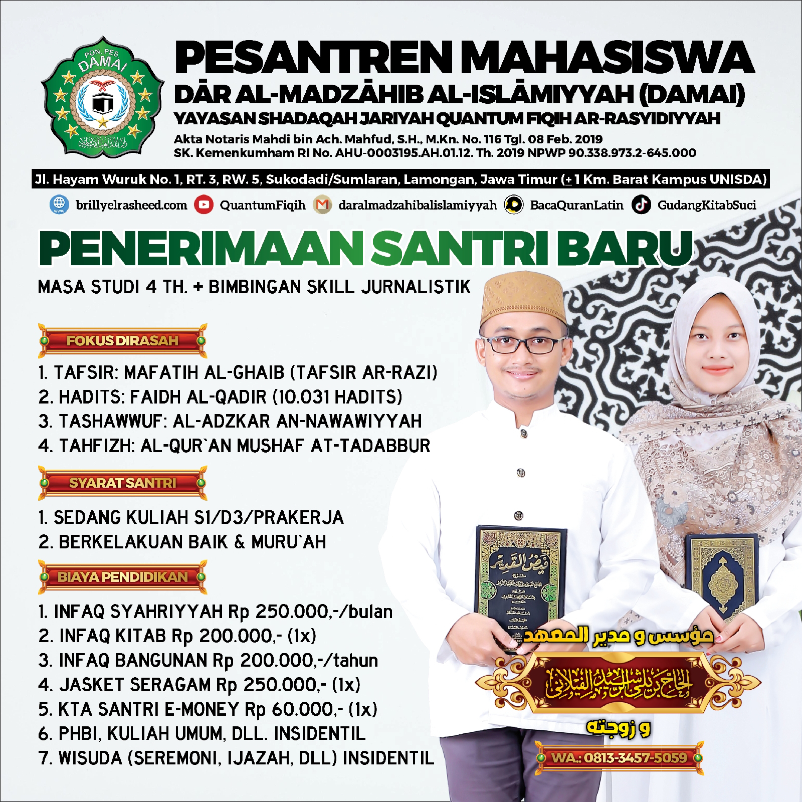 PENERIMAAN SANTRI BARU KULIAH SAMBIL NYANTRI PESANTREN MAHASISWA DĂR AL-MADZĂHIB AL-ISLĂMIYYAH (DAMAI) LAMONGAN JAWA TIMUR